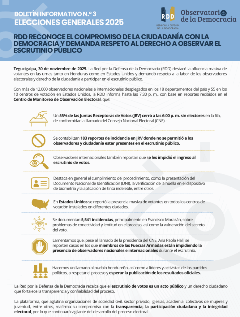 RDD RECONOCE EL COMPROMISO DE LA CIUDADANÍA CON LA DEMOCRACIA Y DEMANDA RESPETO AL DERECHO A OBSERVAR EL ESCRUTINIO PÚBLICO